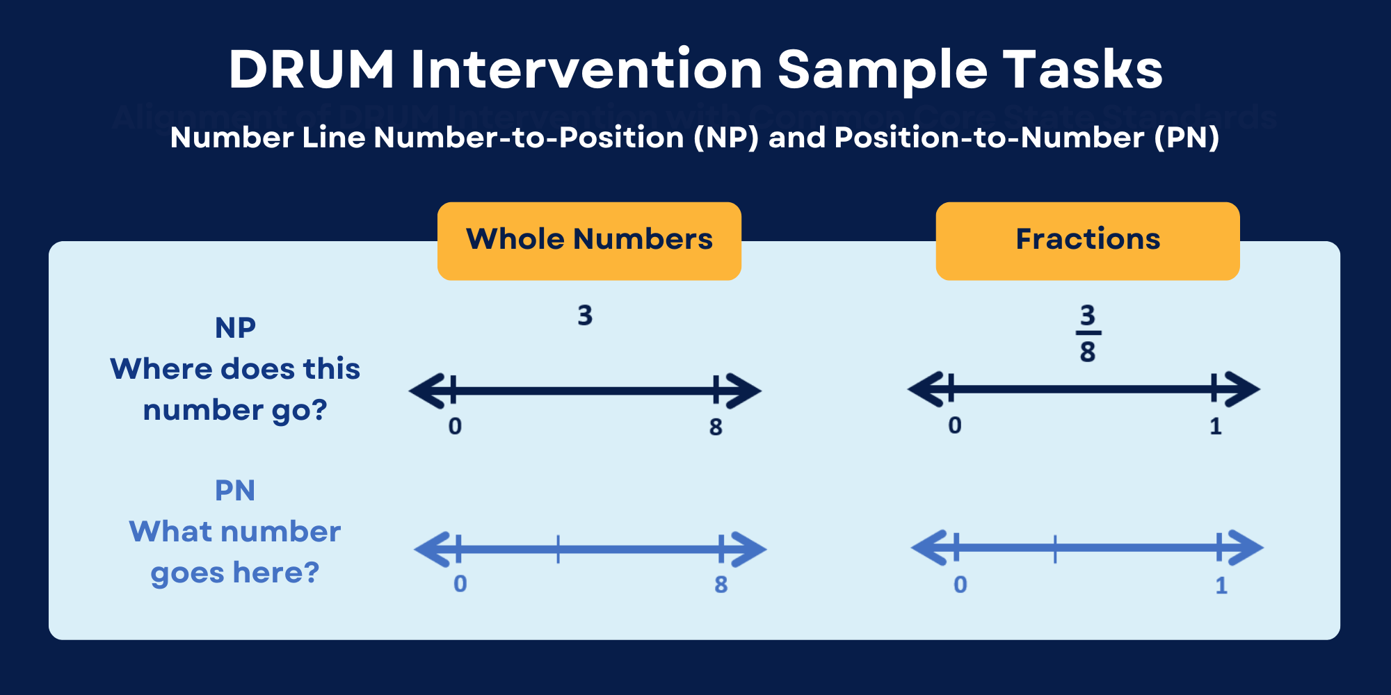 DRUM employs number lines to help children draw analogies. For example, we would show children that 3 is located in the same place on a 0-8 number line as 3/8 is located on a 0-1 number line. Our team (Yu et al., 2022) has published initial findings showing the promise of the DRUM Intervention for helping children learn in the top-tier journal, Developmental Psychology. You can access that report here:
